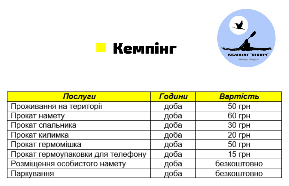 Крім прокату та сплавів, кемпінг «Північ» пропонує паркування авто, ночівля на території у наметах, приготування страв на вогнищі, а також вода, душ, туалет.