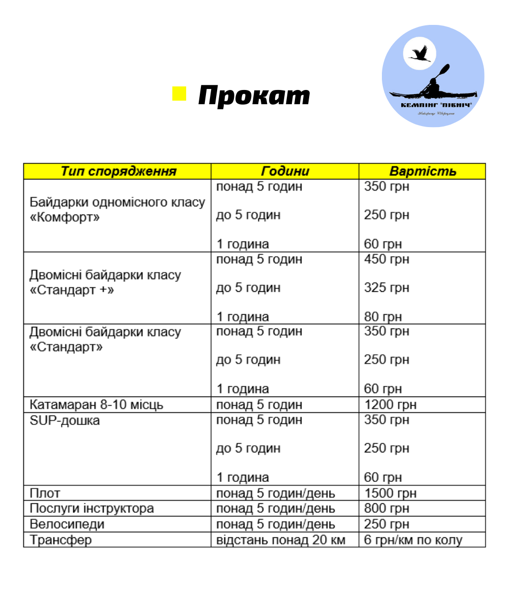У вартість прокату входять: плавзасіб, весло, рятувальний жилет.